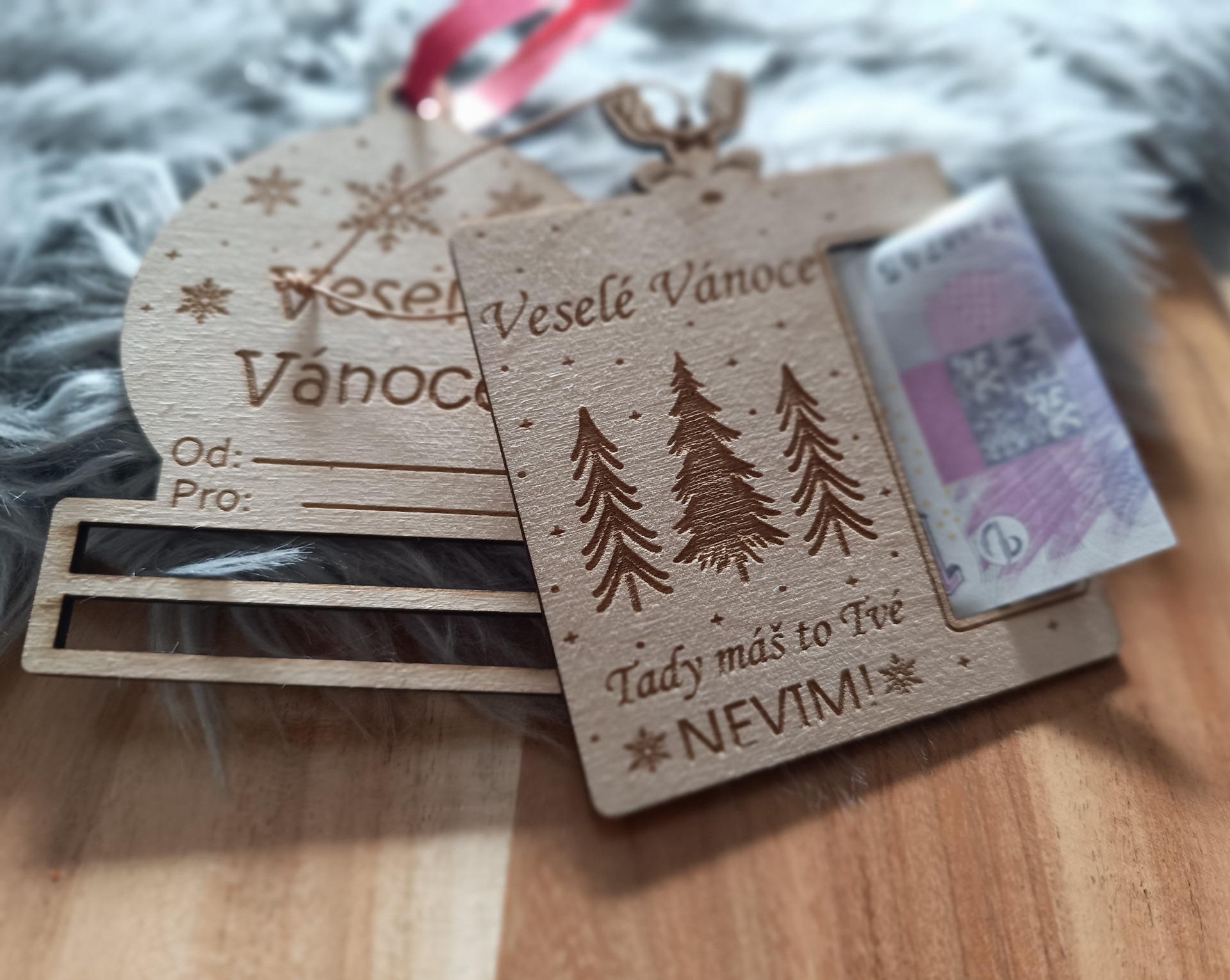 Originální dřevěná vánoční ozdoba s držátkem na peníze – stylový způsob, jak darovat hotovost s vánočním kouzlem. Pro nerozhodné, co nevědí, co pod stromeček :-)